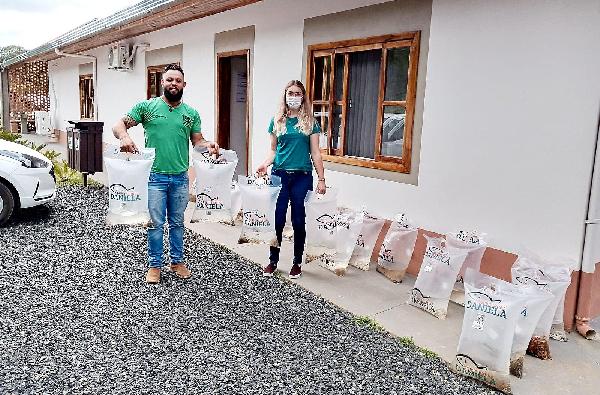 Alexandre Fragoso e Valeria Binek mostram os pacotes com os alevinos. Próxima entrega acontecerá novamente na primeira semana de dezembro